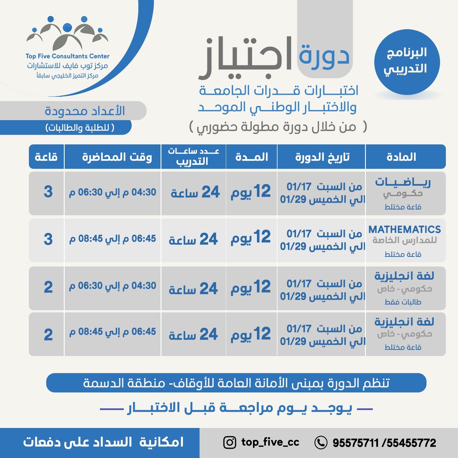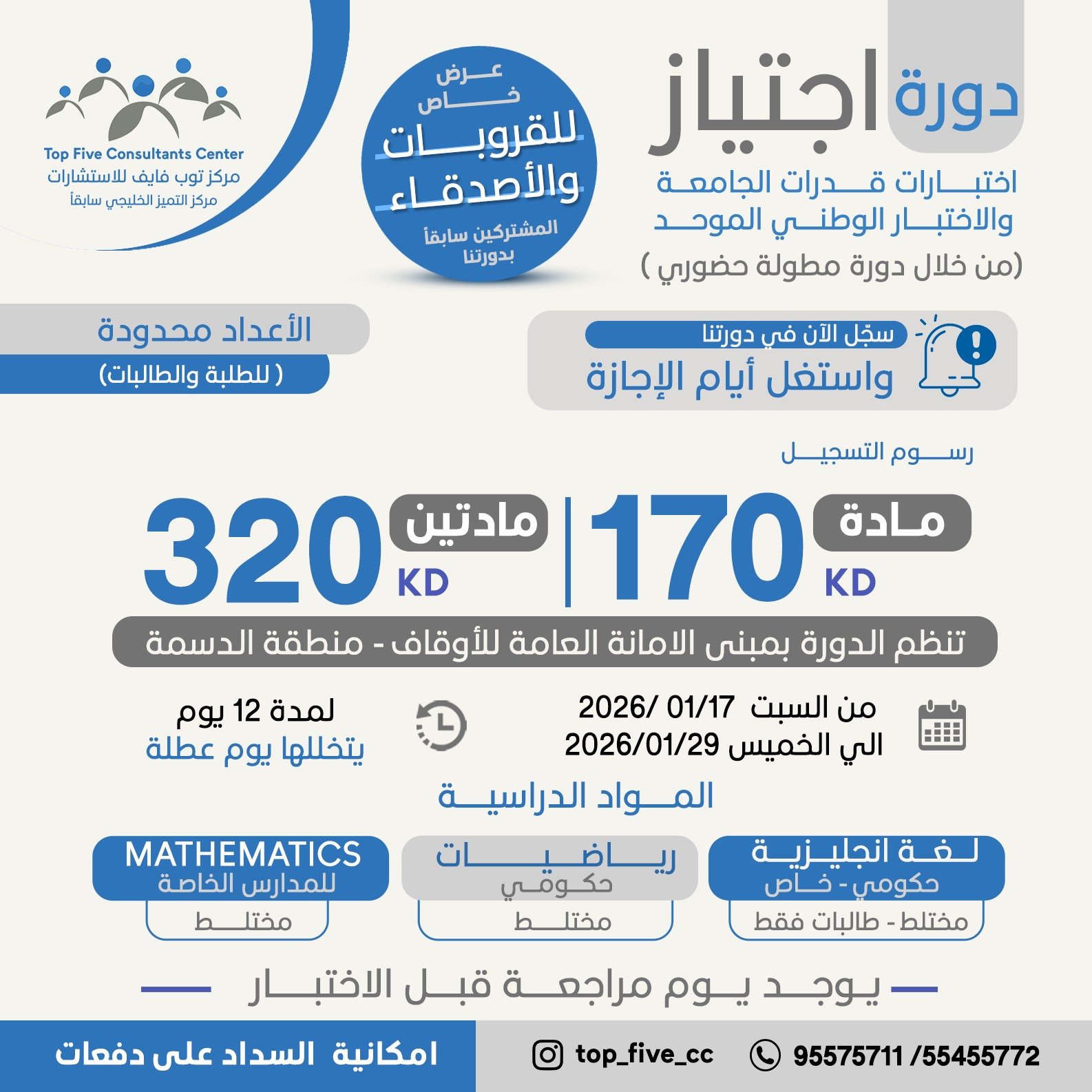 دورة اجتياز اختبارات قدرات الجامعة و الاختبار الوطنى الموحد مطولة حضورى من 2026-01-17 الى 2026-01-29